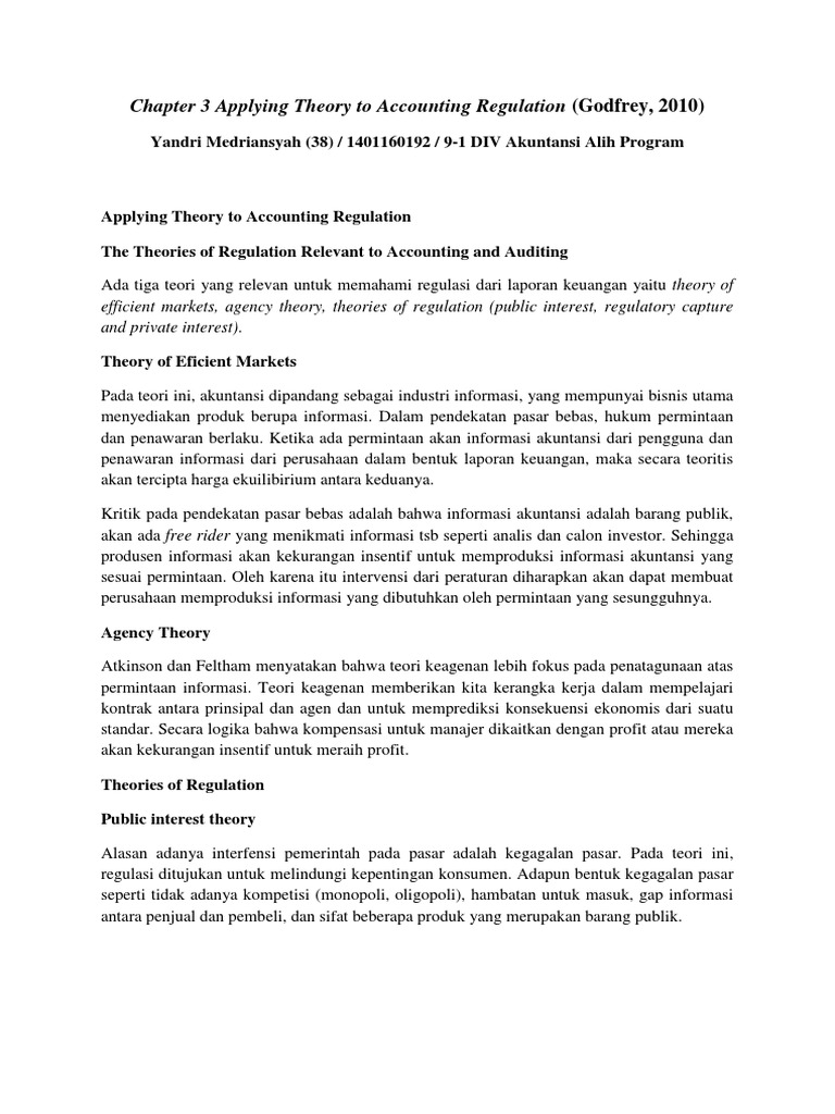 - Applying Theory To Accounting Regulation - These Theories Are Classical Public Interest Theory, Capture Theory, And The Modern Theory Of Credible Commitment.